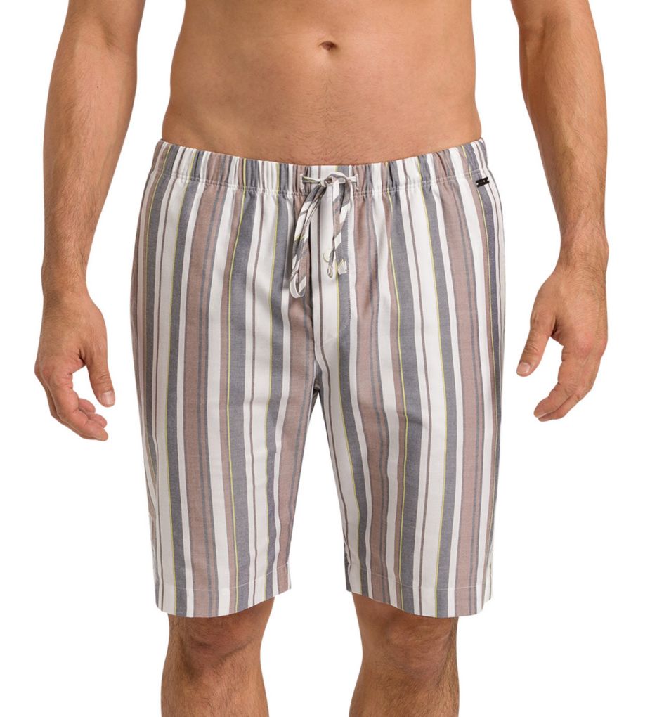 Long sleep shorts with a striped pattern are soft for a comfortable feel with Tencel lyocell. Made of woven cotton and Tencel lyocell. Button fly-front has a large, exposed single button closure. Waistband is covered elastic with a gathered casing for easy flexing fit. Long, flat-woven drawstring ties at front of waist offer fit adjustment. Slash pockets. Punched greytone metal Hanro logo badge is sewn onto left hip. Fabric info tags are sewn into inner back of waist. Oeko-Tex certified to be free of 100 toxic substances. Open fly. Hanro Men's Night & Day Woven Lounge Short (75143) | Size 2XL | HisRoom.com