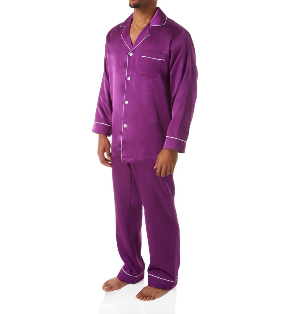 Relax in style with this Big Man size range satin pajama set. Made of woven polyester. Set includes a matching top and bottom. Top has an open notch collar trimmed with white piping. Button front secures with four large plastic buttons with a mother-of-pearl look. Long sleeves have turned back cuffs with piped trim. Chest pocket at the left. Straight hem. Bottoms have a unique waist with covered elastic at sides for a more flexible fit and non-stretch fabric at front and back. Waist has two button closures for fit adjustment. Cuffs have piping at top. Stacy Adams logo and care tags are sewn into back of collar and waist. Open fly. Lightweight woven satin feels comfortable enough for year-round wear. Stacy Adams Men's Big Man Satin Lounge Set in Purple (S21000B) | Size 2XL | HisRoom.com