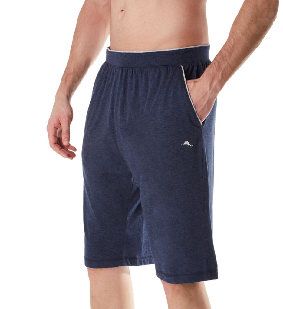 Perfect for the guy looking for a larger size run, this short has sleek, sporty styling with contrast details. Made from cotton and modal. Wide waistband has encased elastic and contrast edges. Flat woven drawstring at the interior front allows you to adapt the fit. Slash pockets at side have coordinating contrast edge. Embroidered sailfish sits below left pocket. Center back seam gives a more natural fit. Rear right pocket has a carved coconut button closure. Grosgrain hang loop at center back waist. Turned and stitched hems. Tagless at back of waist, with care tag at side seam. Flyless. Light, soft knit blend is breathable for comfort in warm weather. Tommy Bahama Men's Big Man Cotton Modal Jersey Lounge Short in Blue (TB31820XB) | Size 3XL | HisRoom.com