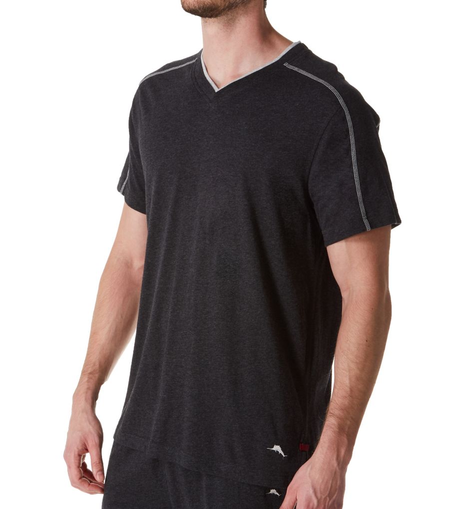 With a relaxed and boxy fit that's cut longer for tall guys, this comfy sleep tee is great for relaxing or napping. Made from cotton and modal. V-neck has inner contrast band for an edge accent. Taped seam at back of neck for comfort. Shoulder panel with contrast stitching gives a smoother fit. Short sleeves have double stitched hems. Straight hems with vents at side for a more open fit. Woven, grosgrain loop sewn above side vents. Signature sailfish embroidered above hem on left side. Relaxed fit. Care tag at side seam, with no tag at back of inner neck. Lightweight, soft knit feels comfortable in any season. Tommy Bahama Men's Tall Man Cotton Modal Jersey Lounge T-Shirt in Black (TB61820XT) | Size 3XL | HisRoom.com
