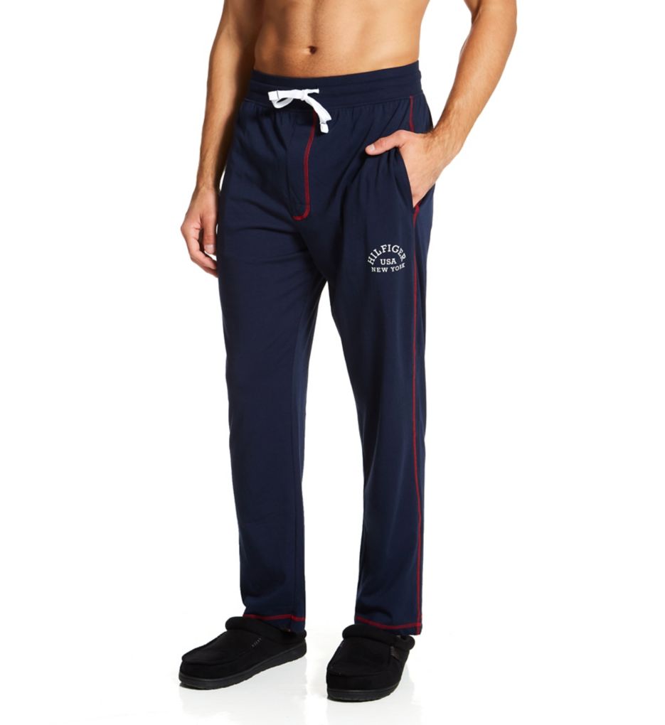 Soft knit cotton-rich pants with Tommy's classic Americana styling. Made of knit cotton and polyester. Wide covered elastic waistband fits close. Drawstring built into waistband adjusts for a tighter fit at front with flat-woven ties. Faux-fly details at front. Contrast thread stitching at front, side seams, and hems. On-seam pockets. Straight-cut legs. Hilfiger, New York, USA graphic on left hip. Flyless. Lightweight knit offers comfort whether it's cold or warm. Tommy Hilfiger Men's Jersey Cotton Stretch Lounge Pant in Blue (09T4094) | Size Large | HisRoom.com