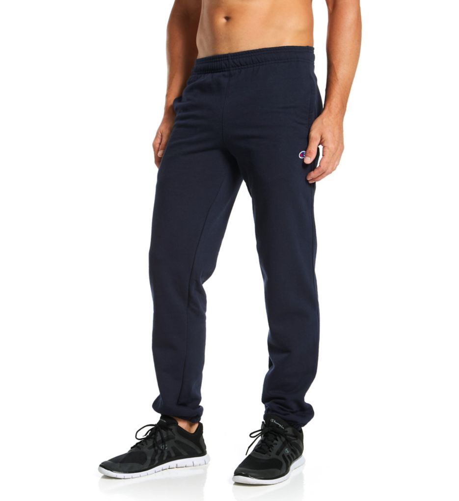 Streamline your look and performance in these soft, durable, fleece pants. A cotton/polyester blend reduces pilling and shrinkage. Feel warm and comfortable without the bulk! Made of cotton and polyester knit. Covered elastic waistband has interior front drawstrings that adjust for a secure, custom fit. Brushed fleece interior provides an exceptionally soft feel. Triple stitching reinforces seams for durability. On-seam hand pockets for convenience. Wide leg openings with elastic cuffs for fit and fuller mobility. Embroidered C logo patch at front of left hip. Loose fit. Midweight fleece pants are ideal for cooler temperatures. Champion Men's Powerblend Fleece Pant in Blue (P0894) | Size Medium | HisRoom.com