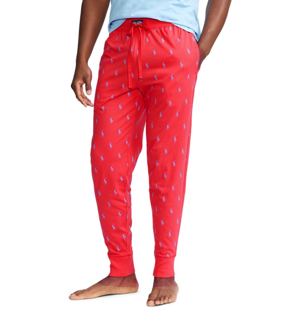 Sporty Pony-covered pajama/lounge bottoms in an extended Tall range. Made of knit 100% cotton. Wide, covered elastic waistband has a smooth, solid covering for a comfortable, close fit. Flat-woven drawstring ties at front allow you to adjust fit around waist. On-seam pockets. Jogger cuffs are solid with a smooth feel. Woven Polo script logo patch is sewn down onto front of waist. Sewn-on fabric info tags inside back of waist. Flyless. Lightweight knit cotton works well for warm or cool weather. Polo Ralph Lauren Men's Tall Man 100% Cotton Jersey Rib Waistband Jogger (PK79RT) | Size XL | HisRoom.com