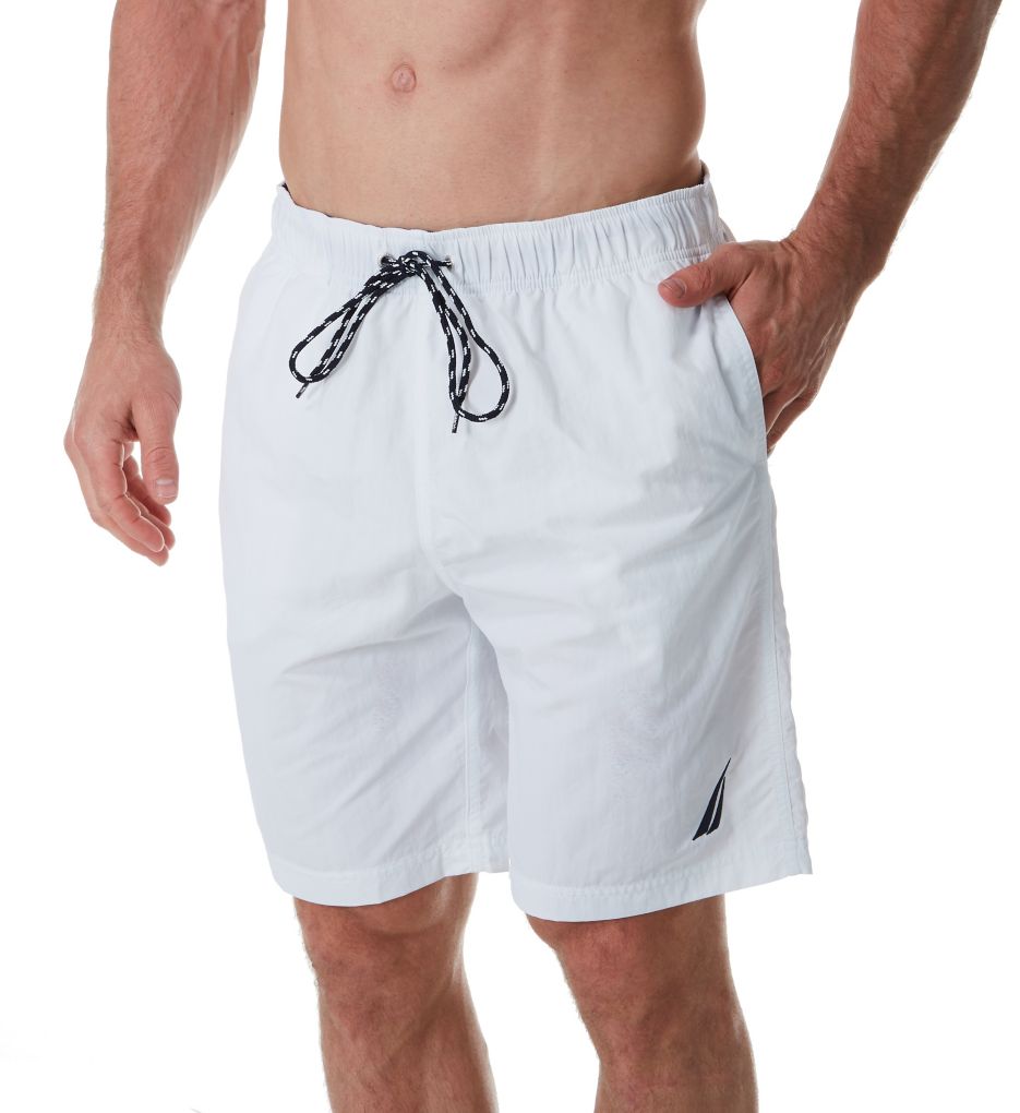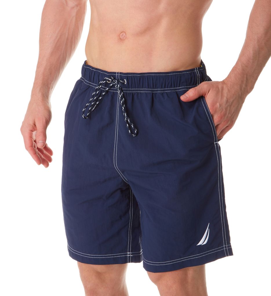 Signature solid swim short has a classic look and durable construction with plenty of pockets and the benefit of fast-drying fabric. Made of woven nylon. Quick-dry fabric works to remove water to cut down on wait-time and weight of fabric. Covered elastic waistband adjusts at front with two-tone drawcord ties. Contrast stitching throughout. Built-in brief-style mesh liner for support. On-seam pockets have close-fit openings to help prevent things from falling out, with mesh interiors for water drainage. Back patch pocket on right side has pull tab, hook-and-loop closure tab and water-draining grommet. Key pocket is woven and is attached to inner waist at front right. Large Nautica logo is embroidered onto left leg above hem. Flyless. Nautica Men's Quick Dry Signature Swim Trunk (T71053) | Size 2XL | HisRoom.com