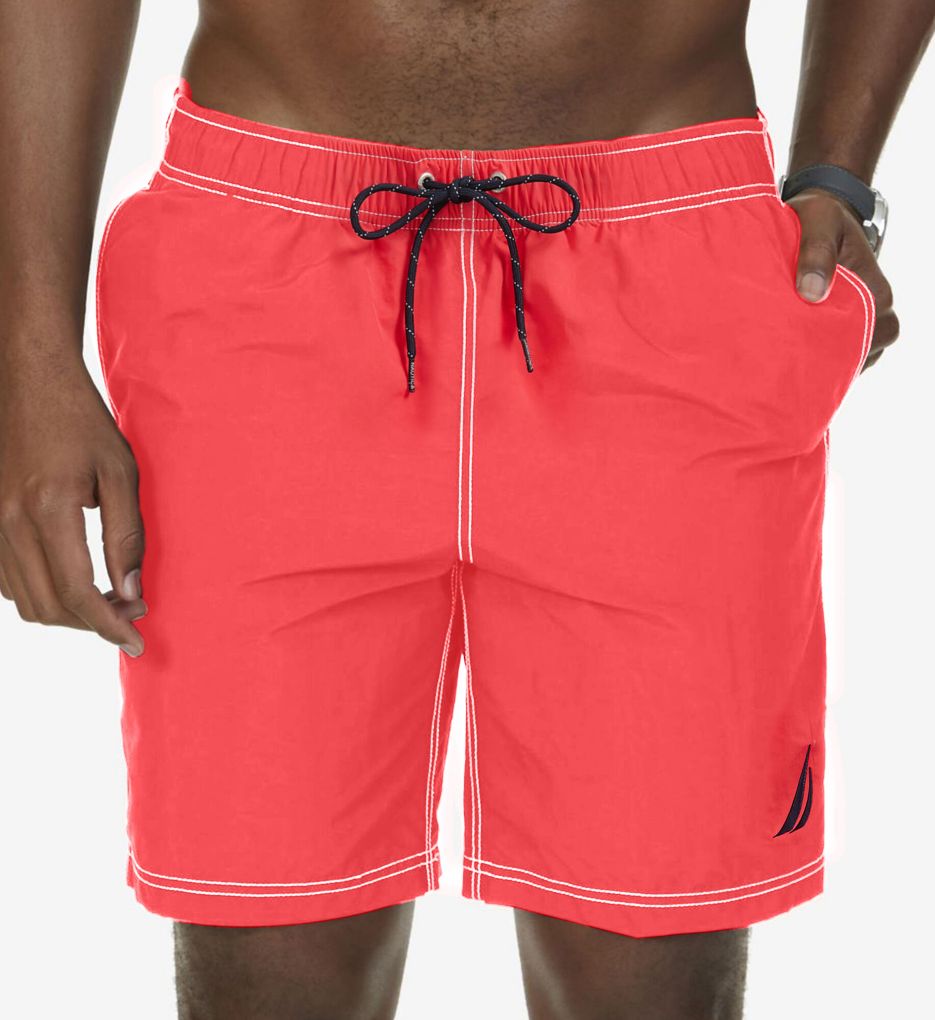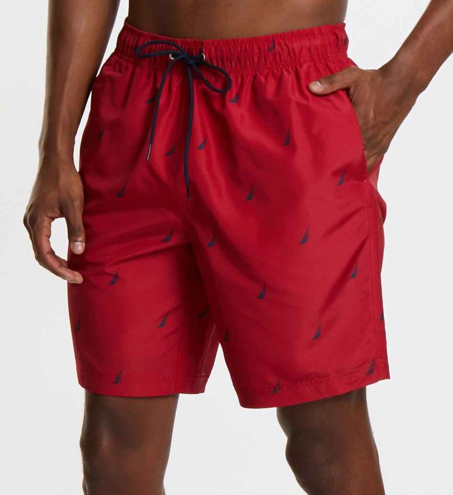 Classic swim trunks with an above-the-knee length covered in the classic sail logo. Made of woven polyester with nylon lining. Quick-dry water repellent treatment helps fabric resist taking in water and dry faster. Gathered covered elastic waistband with an adjustable drawcord built into it. Classic mesh brief-style inner liner for more support and less chafing. Waist adjusts for fit with ties on outside of front. On-seam pockets drain easily with mesh interiors. Welt pocket built into back right of trunk has an overlapping opening and a hook-and-loop pad. Large woven fabric key pocket with overlapping flap attached to inner front right of waist. Fabric information tags are attached to key pocket. Flyless. Nautica Men's Sailboat Print 8 Inch Swim Trunk in Red (T01130) | Size Small | HisRoom.com