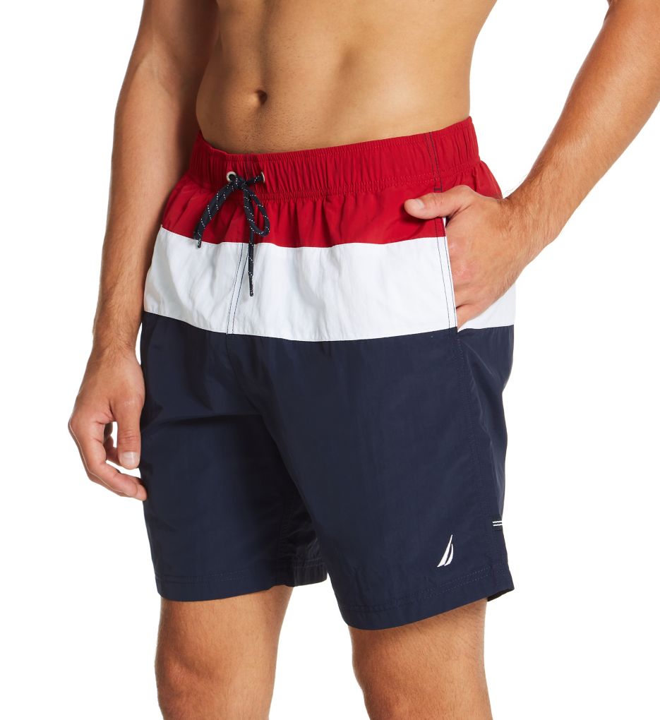 Make a bold statement in these tri-color block trunks. The fabric has quick drying properties for lasting comfort. Inner key pocket can hold your house key or credit card. Made of nylon and polyester. Quick dry fabric allows for all-day, dry comfort. On-seam pockets are deep enough to hold your phone or keys. Small key pocket is sewn at inner front waist. Trunks have mesh liner for easy drainage. Covered elastic waistband has outer drawstring that loops through silver grommets at center. Rounded drawstring has plastic end caps. Left leg has Nautica logo. Leg hems are self-lined. Sewn-in tag provides fabric blend and care. Flyless. Nautica Men's Color Block Quick Dry Swim Trunk (T11003) | Size 2XL | HisRoom.com