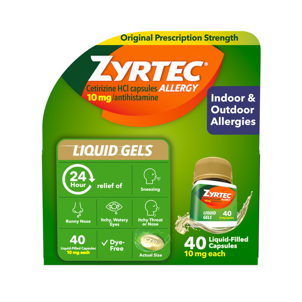 24-count bottle of Benadryl Liqui-Gels antihistamine allergy medicine, Provides multi-symptom allergy relief and cold symptom relief, Contains 25mg of diphenhydramine HCl 25 mg per liquid capsule, Relieves allergy symptoms of sneezing, runny nose, itchy nose or throat, and itchy, watery eyes, Relieves cold symptoms of sneezing and runny nose to provide more than just allergy relief, Antihistamine tablets that work to put your allergy symptoms to rest, Dye-free Benadryl formula that is free of added colors, Allergy relief for ages 6 and up that works when you need it most