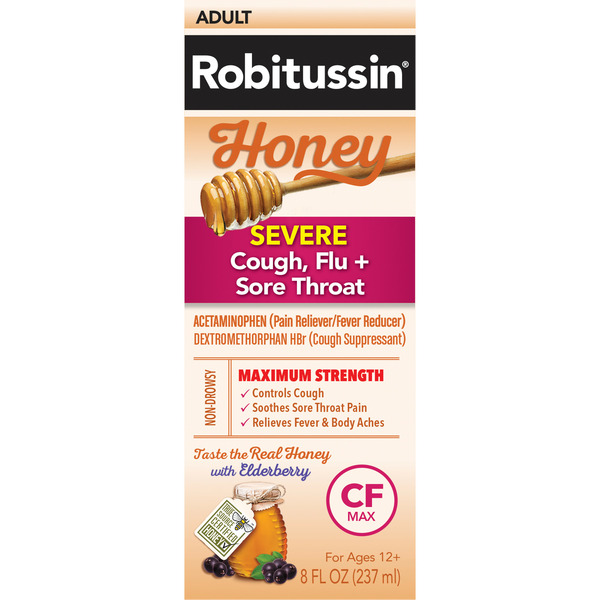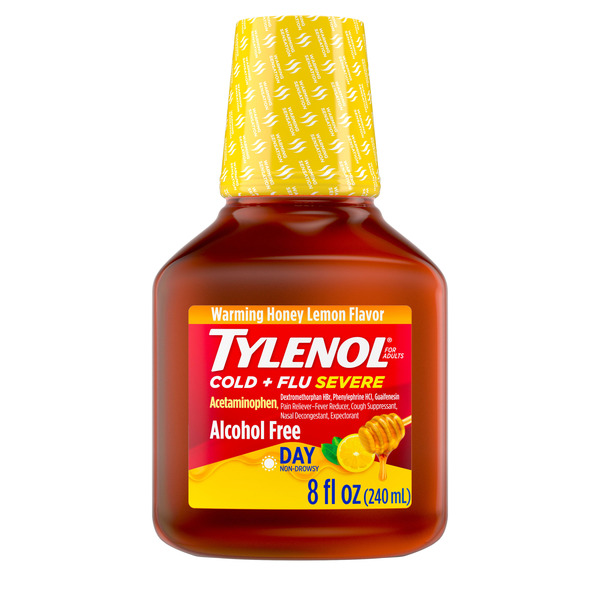 Provides temporary relief of cold and flu symptoms, Each 15 mL contains:, 325 mg of acetaminophen pain reliever/fever reducer10 mg of the cough suppressant dextromethorphan5 mg of the nasal decongestant phenylephrine200 mg of the expectorant guaifenesin Relieves minor aches and pains, nasal congestion, coughing, and sore throat, Soothes with gentle warming sensation and Honey Lemon flavor