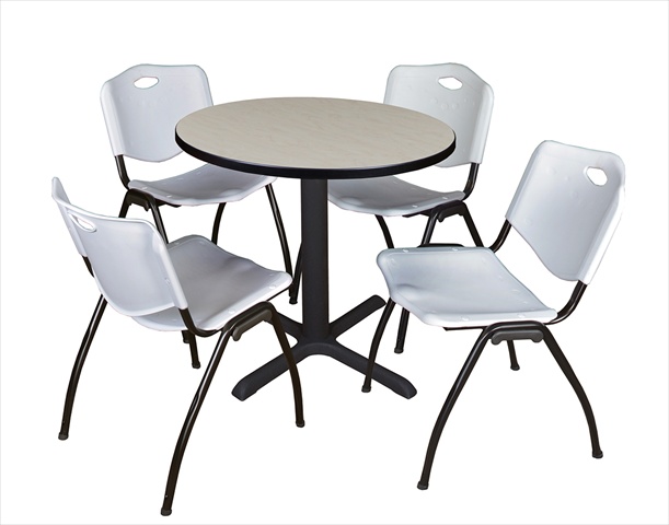 SpecificationsThe Table Top is constructed of thermal fused melamine that protects against stains, burns, bumps and bruises. A black PVC edge adds extra protection. The Cain X-Base is constructed of a black tubular steel post and solid steel legs with a textured powder coat finish. The table feet feature hidden adjustable glides that make this table ideal for training rooms, lunch rooms, restaurants, cafes, or small conference rooms. The M stack chairs feature sturdy black metal frames with glides to eliminate floor damage. A color permeated seat and back is contoured for additional comfort and can be transported easily with a convenient built in handle. These chairs can be stored in stacks of 12.