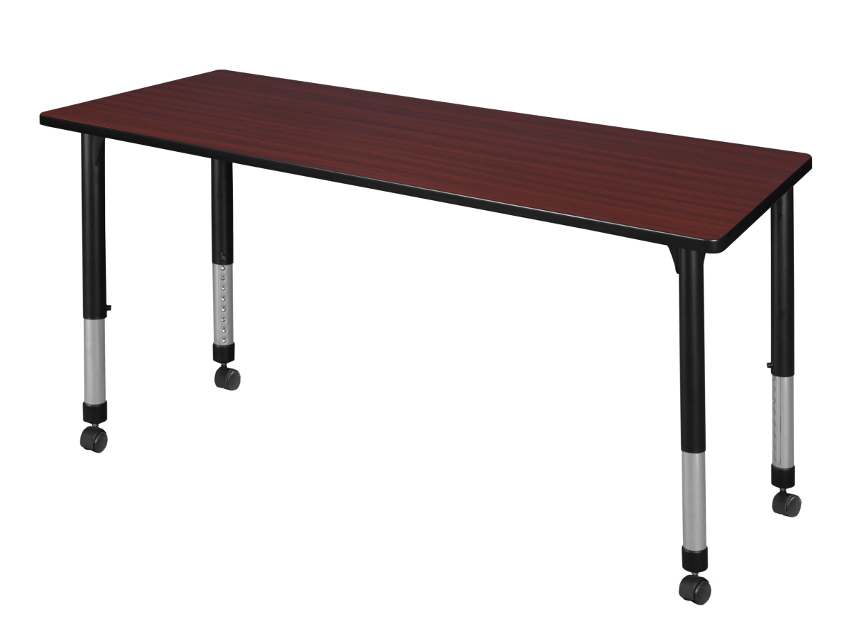 Give everyone more room with Kee tables. Mobile classroom table sets include four height adjustable post legs and casters to accommodate students of all ages. Setting up a Classroom has never been easier! Height is easy for adults to adjust by loosening and tightening a bolt with the included hex key. This 66-inch long classroom table assembles in a snap with just a few screws. The table is constructed of a thermal fused melamine Mahogany laminate tabletop that is 1-inch thick and finished with a black T-Mold edge band. Laminates are scratch, stain and scald resistant and wipe clean easily. Rounded corners make the table safer for everyone. A sleek alternative to pedestal style bases, the adjustable post legs come in a classic black with chrome underneath. Adjustable glides on the bottom of the base ensure a level tabletop and are easy to adjust.
