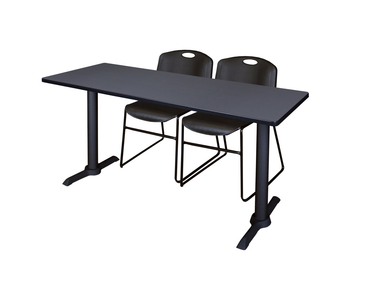 SpecificationsWhether you are planning a lounge, cafe, library, breakroom or restaurant, let the Cain Collection take you there. These versatile tables are at home in stylish cafe or coffee shop settings as well as training rooms. This set includes a 60-inch Cain training table and 2 Black Zeng Stack Chairs. The table is constructed of a thermal fused melamine Grey laminate tabletop that is 1-inch thick and finished with a black T-Mold edge band. Laminates are scratch, stain and scald resistant and wipe clean easily. Rounded corners make the table safer for everyone. The stylish T-Base legs are constructed of tubular steel posts and solid steel T-Bases. Hidden adjustable glides on the bottom of the base keep the legs and tabletop level and are easy to adjust. Patent-Pending Zeng stack chair is not only unique, but durable, sturdy and versatile as well. The Zeng seat and back are treated with an anti-microbial agent, which makes it perfect for schools, waiting rooms, cafeterias and more. A reinforced black metal frame is designed to support up to 400lbs and a built in handle makes moving the chair easier. All chairs are backed by a 5-year limited manufacturer warranty on chair bases and frames and a 2-year limited manufacturer warranty on chair mechanisms and upholstery. Cain tables are backed by a 10-Year Limited manufacturer Warranty.