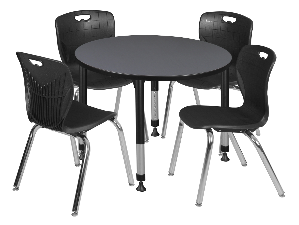 SpecificationsGive everyone more room with Kee tables. This set comes with one 36" Round Table and four Black Andy 18-in Stack Chairs. Kee adjustable post legs come four to a set and are height adjustable to accommodate students of all ages. Height is easy for adults to adjust by loosening and tightening a bolt with the included hex key. This 36-inch Round classroom table assembles in a snap with just a few screws. The table is constructed of a thermal fused melamine Grey laminate tabletop that is 1-inch thick and finished with a black T-Mold edge band. Laminates are scratch, stain and scald resistant and wipe clean easily. Rounded corners make the table safer for everyone. A sleek alternative to pedestal style bases, the adjustable post legs come in a classic black with chrome underneath. Adjustable glides on the bottom of the base ensure a level tabletop and are easy to adjust. The stylish and durable Andy stack chair is ideal for classrooms, breakrooms and more. It is constructed of a flexible and durable polypropylene seat and back and a chrome-colored tubular steel frame and stores away in stacks of 12. The Andy chair ships assembled and is ready to use immediately. All Regency chairs are backed by a 5-year limited manufacturer warranty on chair bases and frames and a 2-year limited manufacturer warranty on chair mechanisms and upholstery.