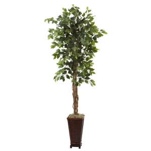 Bring the beauty of the outdoors inside with this stunning artificial Ficus tree. It features natural trunks and over 750 lifelike silk leaves, making it a bold statement piece for any room. Complete with a decorative planter, this Ficus tree is perfect for your home or office, and makes a great gift for any plant lover. Product Features: Lifelike and bold Ficus tree for your decor needs Over 750 silk leaves for a realistic appearance Housed in a decorative planter No maintenance or watering is required Assembled in the USA Care instructions: wipe clean with a soft dry cloth For indoor use only Dimensions: 6.5'H x 32 W x 32 D fully fluffed, includes height of the planter Planter dimensions: 17.25 H x 8.75 W x 8.75 D Material s : plastic Note:Item will need to be reshaped when removed from the box