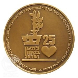 This medal honors with love and gratitude the soldiers of the IDF who protect the State of Israel and her citizens with bravery and dedication. LIBI is a charitable fund that assists members of the Israel Defense Forces through projects that improve their quality of life and enhance their well-being. 2005 marks the 25th anniversary of the founding of the LIBI Fund by the late Menachem Begin, who was then Prime Minister, and the late Raphael Eitan, the then current IDF Commander-in-Chief. The Fund helps soldiers through educational assistance, improving medical resources and facilities, and special assistance to new immigrants. Among the projects funded by LIBI have been the following: DIPLOMAS FOR SOLDIERS enables soldiers to complete high school diplomas while still serving in the IDF;. donations of AMBULANCES; construction of a REHABILITATION CENTER for soldiers; and a special fund to help needy soldiers purchase food, clothing and other basic items. A portion of the income generated by the sale of these medals will be donated to the LIBI Fund.Obverse: On the medal face the symbol of the 25th Anniversary of the LIBI Fund.Reverse: On the reverse, soldiers in action.Designer: Yigal GabayDetails: 11681590 2005 Bronze 59.0 Diameter mm. 98.0 Weight gm.
