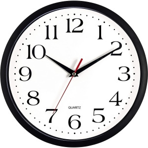 Whisper Quiet Clock Large, easy-to-read numerals. Silent sweep movement eliminates ticking sounds. Large, easy-to-read numerals. Crystal clear convey plastic face is shatter-resistant. Second hand. Our products are the perfect household device to keep you and your family's living conditions optimal. Not just reliable readings, the temperature is equipped to give you daily updates on the record humidity and temperature high and low of any given day, allowing you to compare the current readings to those of the past. SpecificationsColor: WhiteDisplay Type: AnalogMovement Type: QuartzTime Format: Standard 12-Hour Shape: RoundDial Diameter: 9.5 Lens Material/Technology: PlasticMinute Track/Display: YesSecond Hand/Display: YesCase Material: PlasticOverall Diameter: 12 Height: 12 Depth: 2 Width: 12 Power Source: 1 AACompliance Standards: RoHS Compliant