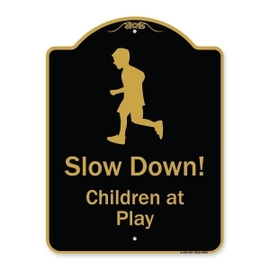 This is a 18 x 24 heavy gauge aluminum sign designed for long lasting outdoor use. The sign is manufactured with radius corners and has precut mounting holes for easy installation. Proudly Manufactured in the U.S.A. by SignMission. Our aluminum products are made from commercial grade corrosive free aluminum specifically rated for outdoor usage for years of maintenance free life in the harshest environments. Our signs will last as long as your business! These signs have pre-punched mounting holes for easy installation. Signs mount to U-channel posts, square or round galvanized posts, wooden posts, all flat surfaces and chain link fences. Signs help protect your business from legal issues and lawsuits while protecting your staff and customers by providing a safe environment. FeaturesHeavy-Gauge Aluminum Architectural SignSigns have rounded/burr-free corners for safe handling and use which provide a professional and architectural appealSigns help protect your business from legal issues and lawsuits while protecting your staff and customers by providing a safe environmentExtremely Durable: SignMission Aluminum products are made from commercial grade corrosive free aluminumProtect Your Business & MunicipalityMade in the USASpecificationsColor: Black & GoldDesign: Slow Down Children At PlayDimension: 1 H x 24 W x 18 LWeight: 3 lbs