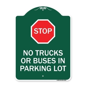 This is a 18 x 24 heavy gauge aluminum sign designed for long lasting outdoor use. The sign is manufactured with radius corners and has precut mounting holes for easy installation. Proudly Manufactured in the U.S.A. by SignMission. Our aluminum products are made from commercial grade corrosive free aluminum specifically rated for outdoor usage for years of maintenance free life in the harshest environments. Our signs will last as long as your business! These signs have pre-punched mounting holes for easy installation. Signs mount to U-channel posts, square or round galvanized posts, wooden posts, all flat surfaces and chain link fences. Signs help protect your business from legal issues and lawsuits while protecting your staff and customers by providing a safe environment. FeaturesHeavy-Gauge Aluminum Architectural SignSigns have rounded/burr-free corners for safe handling and use which provide a professional and architectural appealSigns help protect your business from legal issues and lawsuits while protecting your staff and customers by providing a safe environmentExtremely Durable: SignMission Aluminum products are made from commercial grade corrosive free aluminumSpecificationsColor: Green & WhiteDesign: Parking Lot Rules Sign Stop - No Trucks or Buses in Parking Lot with Stop SymbolDimension: 1 H x 18 W x 24 LWeight: 3 lbs