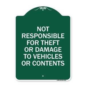 This is a 18 x 24 heavy gauge aluminum sign designed for long lasting outdoor use. The sign is manufactured with radius corners and has precut mounting holes for easy installation. Proudly Manufactured in the U.S.A. by SignMission. Our aluminum products are made from commercial grade corrosive free aluminum specifically rated for outdoor usage for years of maintenance free life in the harshest environments. Our signs will last as long as your business! These signs have pre-punched mounting holes for easy installation. Signs mount to U-channel posts, square or round galvanized posts, wooden posts, all flat surfaces and chain link fences. Signs help protect your business from legal issues and lawsuits while protecting your staff and customers by providing a safe environment. FeaturesHeavy-Gauge Aluminum Architectural SignSigns have rounded/burr-free corners for safe handling and use which provide a professional and architectural appealSigns help protect your business from legal issues and lawsuits while protecting your staff and customers by providing a safe environmentExtremely Durable: SignMission Aluminum products are made from commercial grade corrosive free aluminumMade in the USASpecificationsColor: Green & WhiteDesign: Not Responsible for Theft or Damage to Vehicles or ContentsDimension: 1 H x 18 W x 24 LWeight: 3 lbs