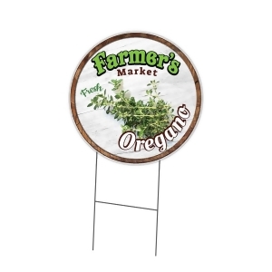 These 16" diameter yard signs are specifically designed for outdoor use with the included H-frame wire stake s for easy ground mounting. The signs can also be used without the stake if wall, fence or vehicle mounting is required as well! Choose between a single-sided or double-sided sign, printed on waterproof 4 mm corrugated plastic. SignMission Yard Signs deliver the most budget friendly form of advertising & messaging. The signs are perfect for along roadsides, in front of retail spaces or for residential applications. You can't go wrong with a SignMission yard sign! FeaturesCoroplast Yard Sign with StakeCertified for Outdoor and Indoor ApplicationsCorrosion and Fade Resistant & WaterproofSingle-Sided OR Double-Sided ImageryMade in the USA4 mm corrugated plastic printed with premium-grade inksSpecificationsDesign: Farmers Market OreganoDimension: 16" H x 0.04" W x 16" LWeight: 0.1 lbs