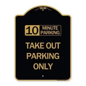 This is a 18 x 24 heavy gauge aluminum sign designed for long lasting outdoor use. The sign is manufactured with radius corners and has precut mounting holes for easy installation. Proudly Manufactured in the U.S.A. by SignMission. Our aluminum products are made from commercial grade corrosive free aluminum specifically rated for outdoor usage for years of maintenance free life in the harshest environments. Our signs will last as long as your business! These signs have pre-punched mounting holes for easy installation. Signs mount to U-channel posts, square or round galvanized posts, wooden posts, all flat surfaces and chain link fences. Signs help protect your business from legal issues and lawsuits while protecting your staff and customers by providing a safe environment. FeaturesHeavy-Gauge Aluminum Architectural SignSigns have rounded/burr-free corners for safe handling and use which provide a professional and architectural appealSigns help protect your business from legal issues and lawsuits while protecting your staff and customers by providing a safe environmentExtremely Durable: SignMission Aluminum products are made from commercial grade corrosive free aluminumProtect Your Business & MunicipalityMade in the USASpecificationsColor: Black & GoldDesign: 10 Minutes Parking Take Out Parking OnlyDimension: 1 H x 18 W x 24 LWeight: 3 lbs