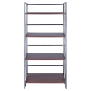 Introduce a touch of industrial elegance with the 4-tier shelf. Featuring five walnut-finished engineered wood shelves paired with a graphite metal frame, this etagere offers open space for books or decor. Ideal for the entryway, kitchen, or office, its relaxed design and stylish support make it a versatile storage solution. Product Features: 4 tier storage shelf Open concept rack with graphite and walnut finish X-frame side panels that with the rear crossbars Protective plastic footers prevent floor scratches Hardware needed for assembly is included Anti-tip hardware included Assembly required Made in Thailand Recommended for indoor use only Dimensions: Overall size: 48.5 H x 24.75 W x 12 D Shelf dimensions: 23.25 wide x 12 deep Distance between shelves: 12.25 high Distance from top shelf to highest point of side panel: 6 high Max weight capacity per shelf: 20 lbs Material s : wood/metal