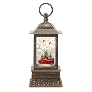 Create a magical holiday display with this LED lighted Christmas lantern featuring a weathered brushed bronze finish. Inside the lantern, a charming vintage red truck, snow-covered green pine trees, a white twig tree, and two red cardinal birds create a peaceful winter woodland scene. The built-in warm white LED light softly illuminates the interior, while a motorized swirling glitter mechanism mimics falling snow for a shimmering snow globe effect. Includes a convenient on/off switch with a 6-hour timer, a USB power cord, and is battery operated. Perfect for Christmas mantel displays, tabletops, shelves, or as part of a festive winter village. Great for gifting to snow globe collectors, or adding to your collection of holiday lanterns and lighted Christmas decorations. Product Features: Pre-lit with a warm white LED light A motorized mechanism gently swirls the water and glitter for a magical shimmering effect Convenient on/off switch with a 6-hour timer USB cord included Includes a round handle for easy hanging and carrying Requires 3 'AA' batteries - not included Recommend for indoor use only Dimensions: 10.25 H x 4.5 W x 4.5 D Material s : plastic