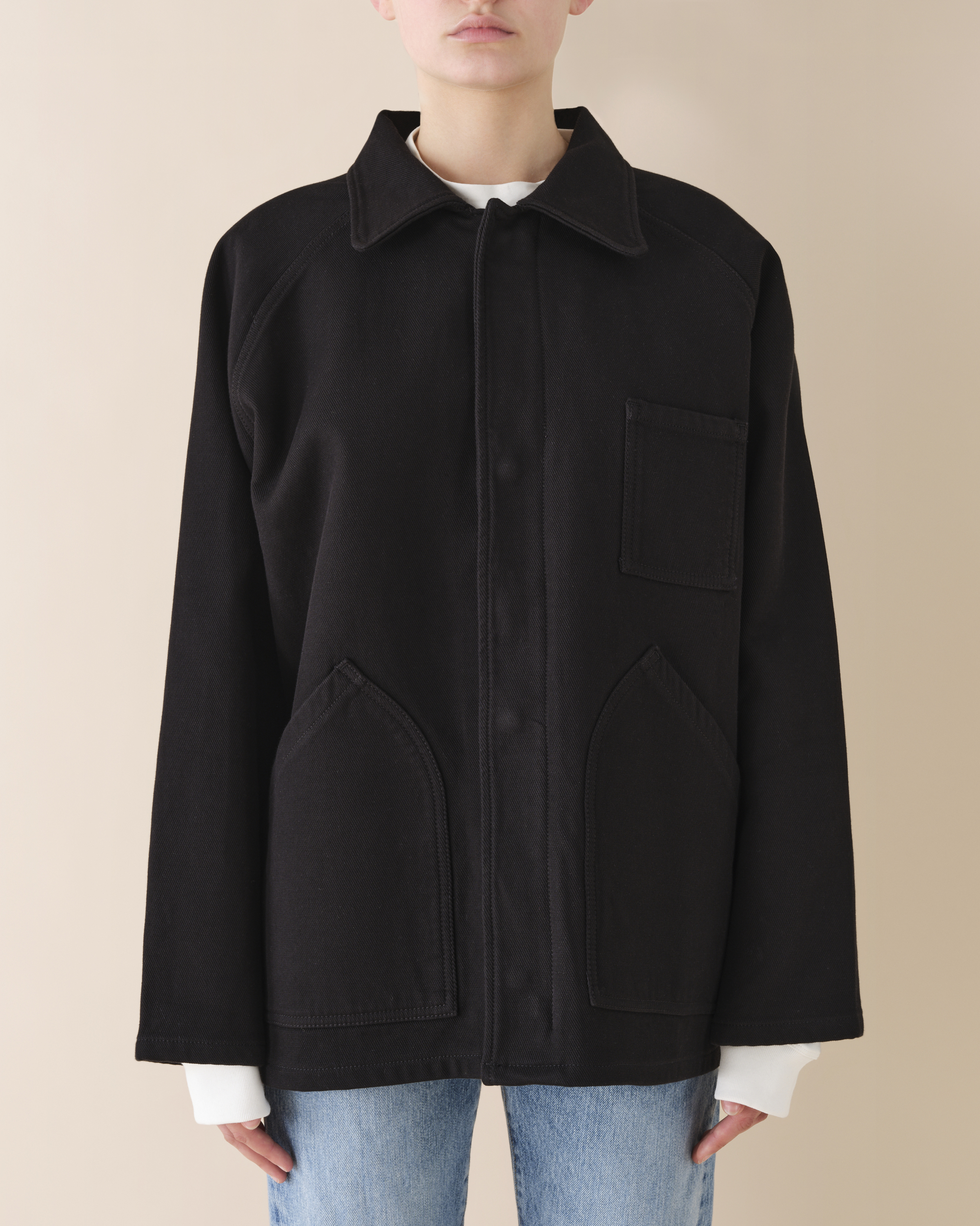 Meet the Tom Black jacket, a unisex workwear essential designed for everyday elegance and durability. Crafted from premium black cotton twill, this jacket feels soft from the first wear and stands up to daily use. Its intentionally boxy fit offers comfort and mobility, while thoughtful details like the rounded collar, practical patch pockets, and raglan sleeves create a modern silhouette. The two-way zip is discreetly hidden behind a buttoned placket, adding a clean, polished finish. Whether you're layering for a casual day or completing a refined look, the Tom jacket balances effortless style with lasting quality, making it a versatile addition to any wardrobe.
