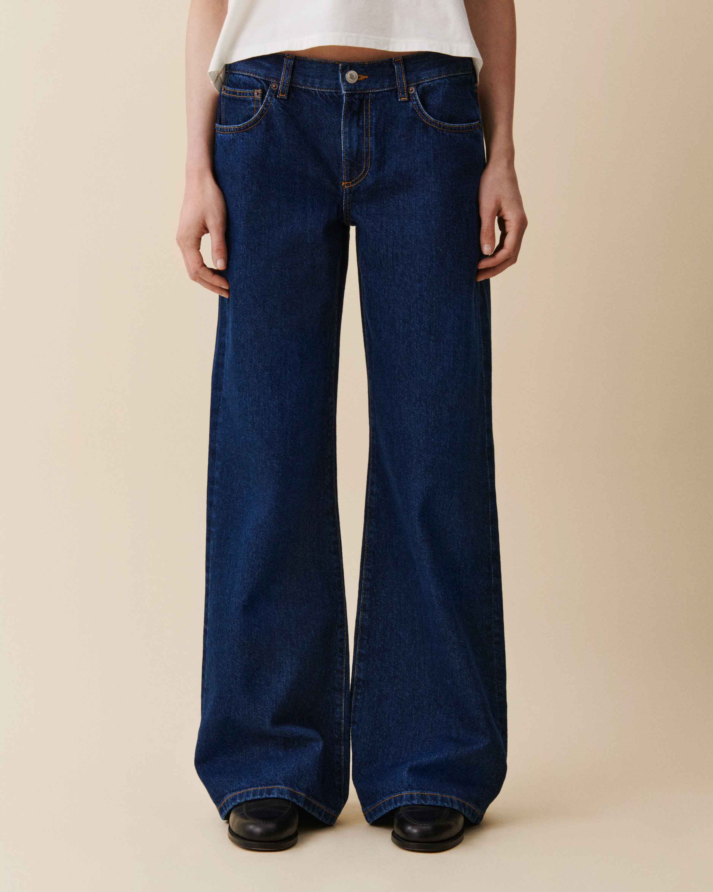 Embrace laid-back, eco-conscious style with the Kyoto Low Waist Flare Jeans. Crafted with over 50% recycled content, these jeans offer a slouchy, loose fit that feels as good as it looks. The low-rise waist and flared leg that expands towards the hem create an effortlessly cool, retro-inspired silhouette. Made from rigid, deep-blue denim with classic tobacco stitching, they provide an authentic vintage feel with a modern commitment to sustainability. The zip fly and relaxed fit ensure all-day comfort without sacrificing an edge of style. For those who want to make a fashion statement while supporting greener practices, the Kyoto jeans are a unique and versatile choice. Add a touch of sustainable edge to your wardrobe with this exclusive design from Jeanerica.