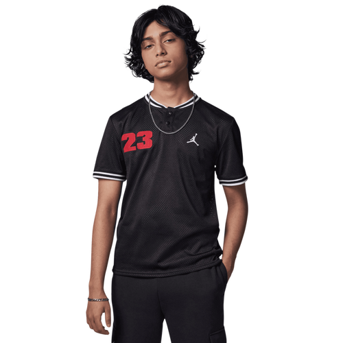 Fuel your boys’ passion for the game with the Jordan 23 Elevated Jersey. Designed with a Henley-inspired silhouette, this breathable poly knit mesh jersey keeps your kids cool whether they’re dominating the court or kicking back with friends. Bold “23” and “Jordan” patches on the chest and back bring signature heritage vibes, while the snap closure on the front neckline ensures easy, hassle-free dressing. From fierce competition to laid-back moments, the Jordan 23 Elevated Jersey ensures your future stars always bring their A-game! Shirttail hem adds an elevated touch. Machine wash. 100% polyester. Imported.