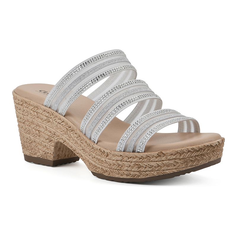 Step up your style with these Cliffs by White Mountain Bianna women's wedge sandals. Click this FOOTWEAR GUIDE to find the perfect fit and more! Step up your style with these Cliffs by White Mountain Bianna women's wedge sandals. Click this FOOTWEAR GUIDE to find the perfect fit and more! FEATURES 3 stretchy straps Cork wedge Foam footbed for all day comfort Slip-on for easy on and offDETAILS Textile upper Synthetic lining Manmade outsole Round toe Slip-on Foam footbed Treaded sole 3-in. heel 1.25-in. platform Spot clean Imported Size: 8.5. Color: Silver Metallic Mesh. Gender: female. Age Group: adult.