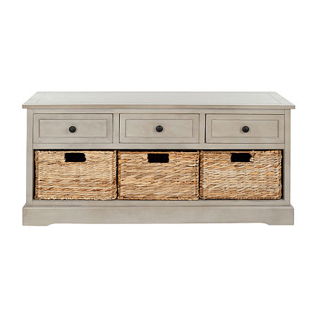 Keep clutter tucked away in style with the Damien Storage Bench. Damien's vintage frame boasts three slim drawers for smaller items above three wicker baskets that slide in and out for easy use, making it ideal for today's busy lifestyles. Bring artistic dimension to home furnishings with this ideal accent piece that complements and blends perfectly with any home decor. This is a great addition to your home whether in the countryside or busy city.Number of Drawers: 6Features: StorageBench Measurements: 15.4 Depth/Inches, 42.1 Width/Inches, 19.7 Height/InchesSeat Height: 20 InWeight (lb.): 49 LbAssembly: AssembledBase Material: 100% WoodFinish: Black, PaintedCare: Wipe CleanDecor Styles: Modern, FarmhouseMaterial: WoodSeat Depth: 16 InCountry of Origin: Imported