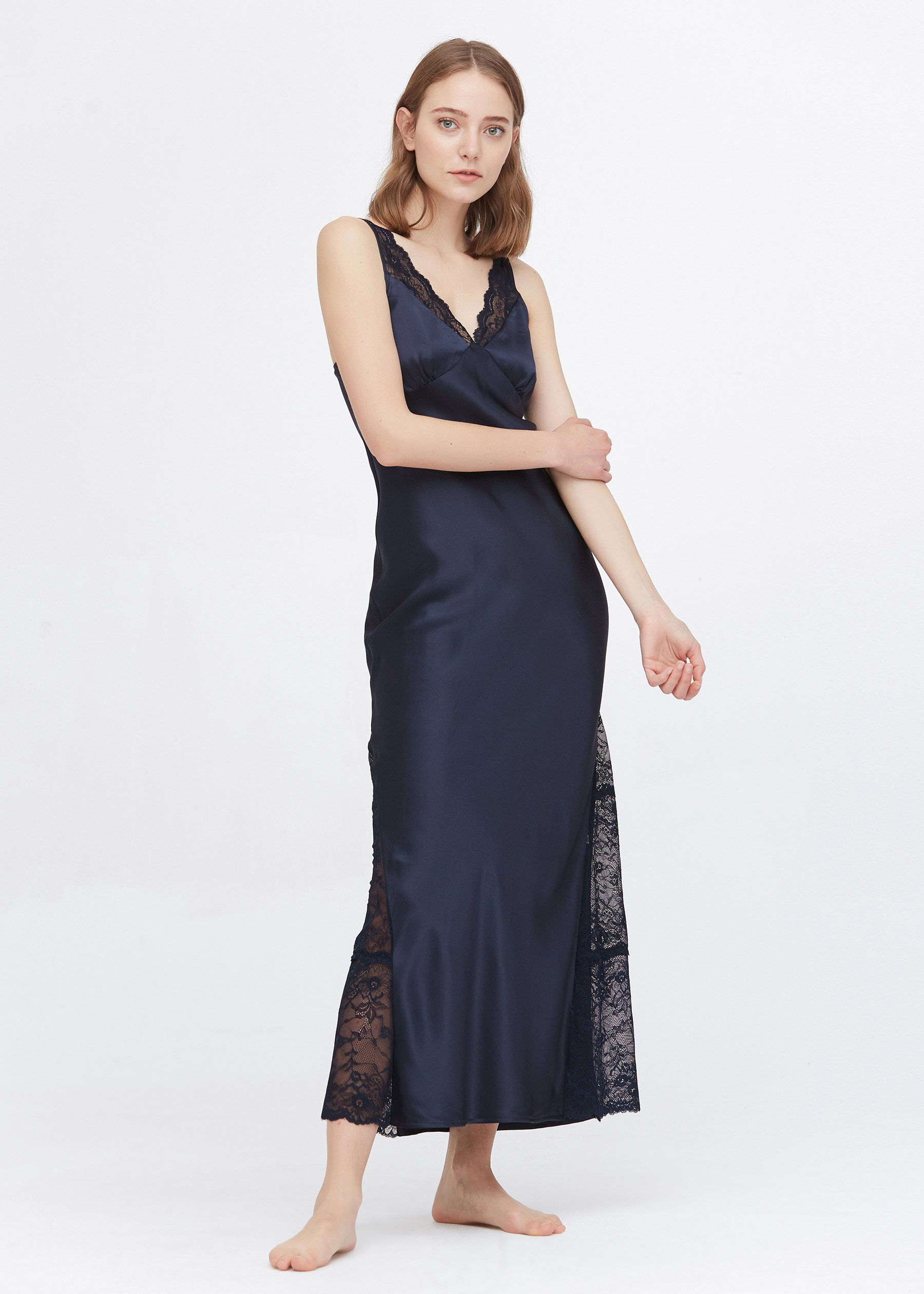 Full Length Silk Lacy Nightgown We've added a feminine touch of luxury to a classic style with our glossy silk fabric and the deliciously soft stretch lace. The generous fit offers as much comfort as it does style. The lace neckline is soft and feminine. This nightdress is the perfect companion for endless comfortable nights. But you can also wear it as a full dress as it is so gorgeous.