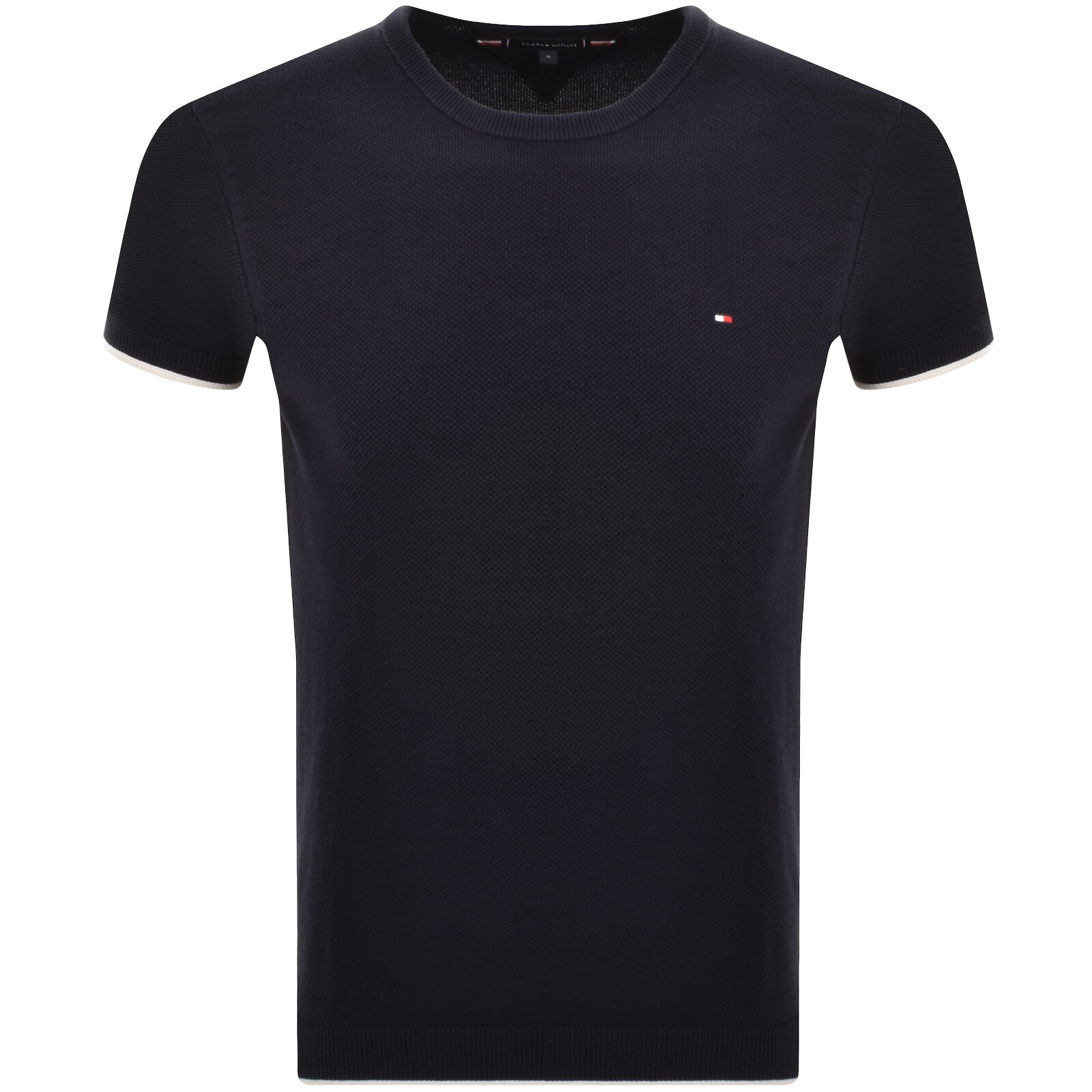 Tommy Hilfiger Tipped Structure Knit Tee In Desert Sky. A ribbed crew neck with ribbed cuffs on the short sleeves and a ribbed waistband featuring a tipped design in white. The signature Tommy Hilfiger Flag logo is embroidered on the left of the chest in red navy and white. Top stitch in navy. 100% Cotton.
