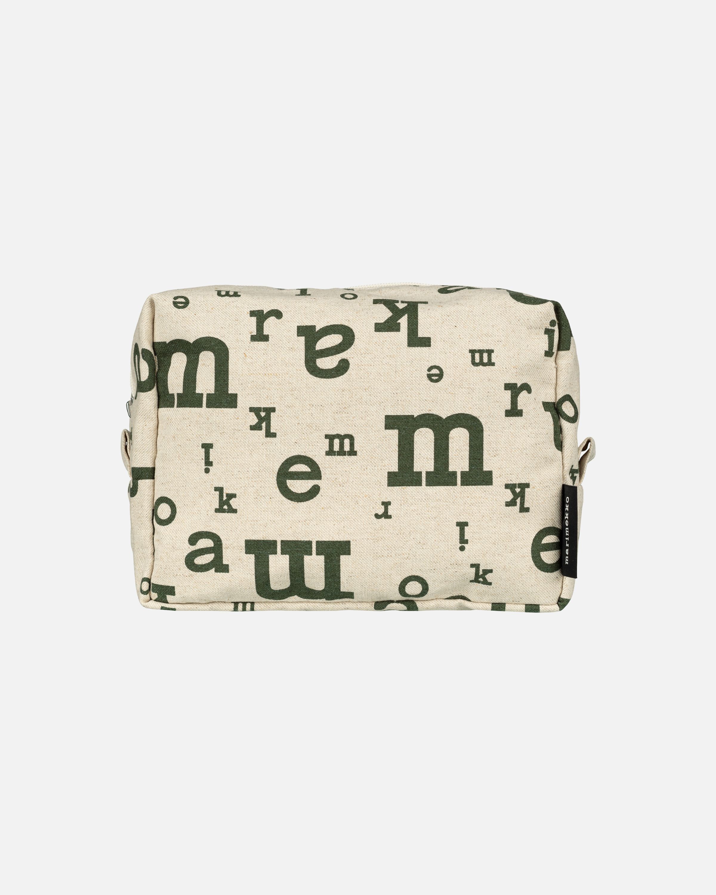 The Tiise Marimerkki cosmetic bag is made of cotton. The bag has a zipper closure and a polyester lining on the inside. Marimerkki (mari mark) is a playful interpretation of the iconic Marimekko logo, created originally in the early 1950s. In this cheerful pattern, our widely recognizable letters float freely in many different sizes.