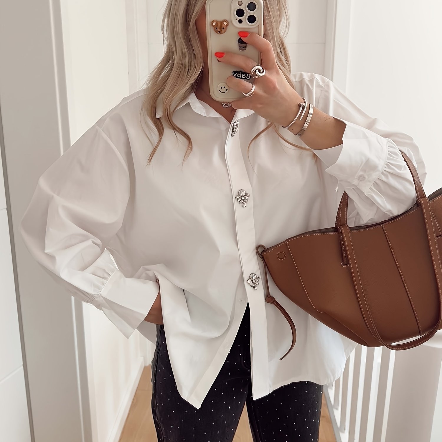 Crafted from smooth Crepe de Chine, the blouse drapes beautifully, providing both comfort and a polished finish. The delicate ribbon trim adds a subtle yet stylish detail, elevating the blouse with a feminine touch. Perfect for pairing with everything from skirts to pants, the Ribbon Trim Crepe de Chine Blouse is an essential piece for a sophisticated, versatile wardrobe. ⢠Our clothing tends to have a generous sizing; if you find yourself between sizes, we suggest ordering one size smaller to achieve a flawless fit. ⢠Crepe de Chine Blouse ⢠Women's Size XS Length is 26". Length May Vary. ⢠Stand Collar V-Neck; Pullover; Bracelet-Length Sleeves (20") ⢠100% Polyester; Unlined ⢠Machine or Hand Wash in Cold Water; Do Not Bleach ⢠Lay Flat to Dry; Iron with Low-Temperature Inside Out