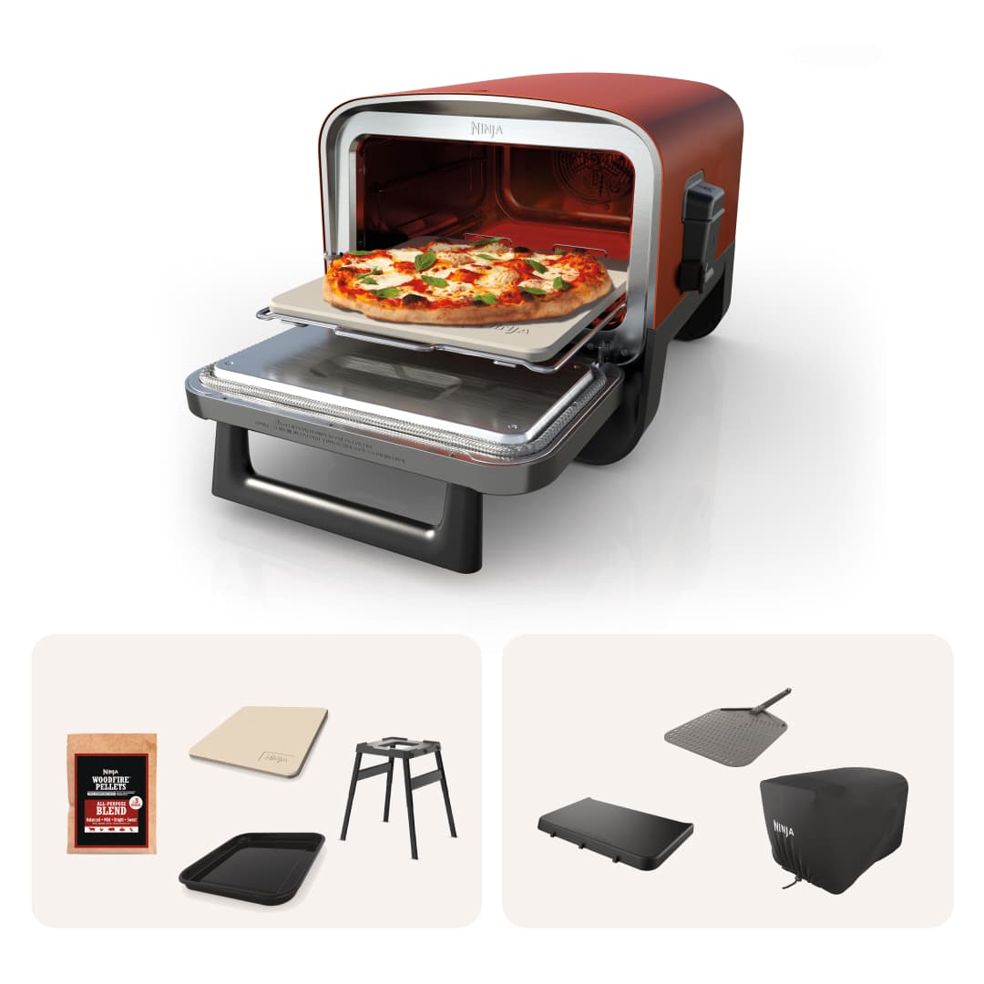 Reimagine what you can cook outdoors with the Ninja Woodfire™ Outdoor Oven. Unlock 8-in-1 versatility with temps from 105-700°F to achieve premium textures and flavors with ease. Add woodfire flavor to anything you make with only 1/2 cup of pellets. Add a Pizza Peel, Side Table, or Cover for free. | Build Your Own Ninja Woodfire™ 8-in-1 Outdoor Oven | OO101B3