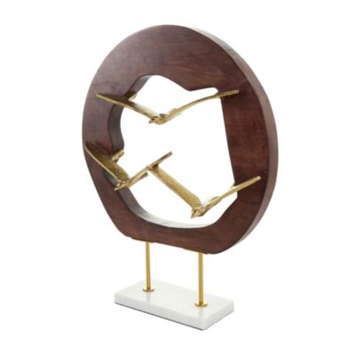 Designed with a free-spirited charm where vibrant hues, eye-catching patterns, and whimsical accents transform your space and showcase your personality. The gold aluminum accents complement the warm tones of the mango wood to give it an eclectic look. Metallic gold aluminum bird sculpture is encased in a brown wooden frame, standing on a white marble base with gold legs. Bring warmth and charm to the home with this bird sculpture that highlights an elevated natural design. The gold aluminum metal sculpture measures 11.9L x 3.55W x 15.25H inches, and weighs 2.91 lbs | Monroe Lane Eclectic Aluminum Metal Sculpture, Gold