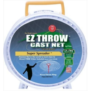 This EZ-Throw 750 Super Spreader Cast net series is designed for the beginner user and it practically opens itself every time you throw it. The secret to the ease of use in the net is it's patented accuthrow ring. The aluminum ring at the top of the net displaces centrifugal force evenly to the cast net ensuring it will open correctly every time. The net is made of clear monofilament resin netting and has a bullseye design that helps secure fish. A high floating 20 ft. Long braided polyethylene hand line and an instructional DVD are included. FeaturesColor - ClearSize - 6 ft. Dimension - 12. 75 x 12. 75 x 3. 13 in. Item Weight - 7. 04 lbs.