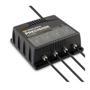 10A 4BNKX10A Precision Charger Longer run times. Shorter charge times. That's the precision difference that keeps anglers on the water longer and puts more fish in the boat. Now, the next generation of this legendary line of chargers has been optimized for 12-volt lithium LiFePO4 batteries. Precision chargers feature battery-type selection by the bank, which now includes charge curves specially formulated for the high demands of lithium batteries, and can even wake these battery types from standby. FeaturesLED Indicator Lights-Inform of charge stage, maintenance mode status, error notifications, and full chargeWaterproof Construction-All on-board chargers are built to be waterproof, shock-resistant and vibration-resistantBattery Type Selection:Each charging bank can be selected to your specific battery type Lithium LiFePO4 AGM.Automatic Temperature Compensation:Precision chargers sense and adjust to ambient temperature fluctuations to ensure a fast, accurate charge.Low-Line Voltage Compensation:When outlets don't put out the 120 volts they are supposed to, Precision Chargers compensate to deliver a fast, consistent charge no matter what.Battery Equalization:Cleans and protects your battery flooded lead-acid only every time you plugin. Also activates a more rigorous, complete cleaning at the push of a button.Digital Control:Microprocessor-based design delivers a faster, more precise charge every time. Precision chargers can even wake dead 12-volt lithium LiFePO4 batteries from standby automatically.Automatic Multi-Stage Charging:Controls the voltage and current your battery gets throughout the charging cycle, ensuring a fast, safe and precise charge.SpecificationsCharger Style: On-BoardOutput per Bank: 10AWattage: 600WCharge Time: 4-6 hoursPower Source: On-Shore ACBattery Type: 12V Lithium LiFePO4, 12V AGM, 12V Flooded Lead Acid12V Lithium-Ion LiFePO4 Optimized: YesWaterproof: YesDigital Control: YesAutomatic Temperature Compensation: YesBattery Equalization: YesBattery Type Selection: YesLED Display: YesSaltwater Compatible: YesBattery Connection: Ring TerminalCharger Input Voltage: 120VCharger Output Amps: 10ACharger Output Voltage: 12/24/36/48VCharging Banks: 4Portable: NoDimension: 9.88 x 9.88 x 3.5 Weight: 14.7 lbs