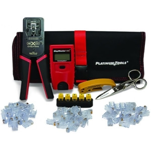 The Platinum Tools 90147 ezEX mini Termination & Test Kit makes the task of terminating Ethernet cables fast and easy. Everything you need contained and organized in a Platinum Tools heavy duty nylon Hanging Tool Pouch. The right tools, the right connector selection and the right tester for termination validation. Kit Includes:EXO Crimp Frame with EXO-EX DieMapMaster mini RJ45 Cable TesterNetwork Map/ID Remote Set, #1 - #5Scissor-Run Electrician's ScissorsCat5e/6 Cable Jacket StripperezEX38 Cat5e Connectors 20 pcs ezEX44 Cat6 Connectors 20 pcs ezEX48 Cat6A Connectors 20 pcs Platinum Tools Hanging Pouch Connector Selection Covers All Categories:EzEX38 Cat5e & Small Cat6EzEX44 Cat6 & Small Cat6AEzEX48 Cat6A & Large Cat6Covers a Wide Range of Insulation Diameters:EzEX38 0.033" - 0.038" 0.84 - 0.97mm EzEX44 0.039" - 0.044" 0.99 - 1.12mm EzEX48 0.043" - 0.048" 1.09 - 1.22mm SpecificationsWeight: 1.5 lbs
