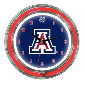 Arizona Neon Wall Clock Brighten up your gameroom with one of our LICENSED COLLEGIATE NEON WALL CLOCKS. These clocks is 14"diameters. What makes these clocks special is that they contain 2 neon tubes - one tube is inside and one is outside illuminating the school's logos and colors from inside out. The clock has a metal chrome case and takes a AA battery. The clock also needs to be plugged into the wall for the neon transformer to be powered. The 14" clocks have another special feature - the neon can be left on stationary or you can set them to blink for an additional visual effect. SpecificationsTeam Name: ArizonaDesign: Blue Face & Red NeonSize: 14 in.Weight: 8 lbs