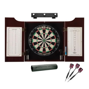 Breathe new life into your darts game with the Viper Dead On Sisal Dartboard and Hudson Cabinet Bundle! you'll be shooting straight and winning every duel after practicing a few times with this set! The Dead On is Tournament Quality Regulation 17.75" in diameter and made from compressed sisal fibers, granting It's substantial longevity in comparison to wood-based boards. This is due to the material's "self-healing" nature: the sisal fibers automatically close the holes left behind by your darts, essentially returning the board to its original state whenever a dart is removed. You can also rotate the detachable number ring around the board, allowing your prime spots to move to a new section when the previous ones wear down. Its staple-free bullseye and galvanized triangular spider wire also significantly decrease your odds of bouncing out upon impact. Usable with virtually any sisal dartboard, the Black Mariah darts are built around coated brass alloy barrels. The alloy itself is durable and inexpensive, while the knurling, grooves and rings on the barrels allow for an easier grip and ensure your throws are consistently accurate. The darts also feature aluminum shafts that utilize a locking mechanism to fit the barrels more securely; these shafts are sturdy enough to withstand any impact, yet still light enough to sail smoothly through the air. Further enhancing their flying ability are the flights, each of which boasts a stylish design. The Hudson Cabinet containing the board is constructed from pine and held together via box joints; its back is reinforced with thick cloth to protect your wall from punctures. The doors of the cabinet are fitted with self-closing brushed nickel hinges and feature built-in dry erase scoreboards. Extra darts can be held in the storage slots built into the lower corners of the board area. The Shadow Buster illuminates your dartboard from above, making it - and all of your targets - visible in any rec room at any time. It also flips up when not in use and runs on four AA batteries. Finally, the dart mat handily rolls out onto your floor without the aid of adhesives to protect it from bounce-outs, and features a throw line embossed directly onto the vinyl. FeaturesTournament Quality Regulation 17.75" dartboard is usable with both steel-tip and soft-tip dartsCompressed sisal fibers re-align after darts have been removed, making the board more durableStaple-free bullseye and galvanized triangular spider wire both reduce bounce-outsRotating number ring allows you to use every section and curb wear and tearDart barrels are made from coated brass alloy and boast unmatched durabilityLightweight aluminum shafts and Black Mariah-print flights ensure your darts fly smoothlyDartboard light fits on any cabinet and flips up when not neededExtra darts can be held in the cabinet's storage slotsSpecificationsColor: Mahogany