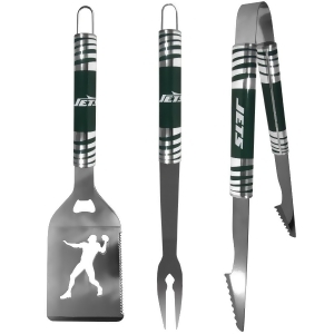 Our tailgater BBQ set really catches your eye with flashy chrome accents and vivid York Jets digital graphics. The 430 grade stainless steel tools are tough, heavy-duty tools that will last through years of tailgating fun. The set includes a spatula with a bottle opener and sharp serrated edge, fork and tongs. FeaturesOfficially licensed NFL productTools are 430 grade stainless steelThe heavy duty spatula features a bottle opener and serrated edgeCrisp chrome graphics with York Jets logo and colors3 PieceSet Includes:Spatula, fork and tongsSpecificationsSize: One SizeLeague Name: NFLTeam Name: York JetsGender: UnisexWidth: 4 in.Length: 16 in.Height: 2.50 in.Weight: 1.4 lbs