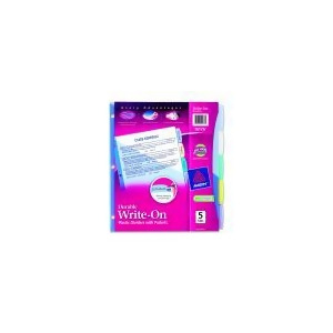 Avery Multicolor 5-Tab Translucent Durable Write-On Divider measuring 11 x 8-1/2 in. allows for frequent reference. Divider with a plastic pocket for extra storage includes stylish, bigger tabs providing 50% more writing space than standard tabs. Divider can be customized using a ballpoint pen or pencil and can also be reused by erasing and writing again. Divider is included with box tops.
