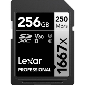 The256GB Professional 1667x UHS-II SDXC Memory Card 2-Pack fromLexarfeatures a storage capacity of 256GB per card and takes advantage of the UHS-II bus to support advanced DSLR functions such as continuous shutter bursts and rapid shooting, as well as raw and JPEG captures. This card is also well-suited for video capture, including 4K, 3D, and Full HD video, and can achieve maximum read speeds of up to 250 MB/sand maximum write speeds of up to 120 MB/s. Thanks to its V60 speed class rating, minimum write speeds are not to drop below 60 MB/s. Features256GB Capacity per CardUHS-II / V60 / U3 / Class 10Records Full HD, 3D, and 4K VideoBuilt-In Write Protect SwitchDownloadable Image Rescue SoftwarePack of 2SpecificationsCard Type: SDXCStorage Capacity: 256 GBMax Read Speed: 250 MB/sMax Write Speed: 120 MB/sMin Write Speed: 60 MB/sBus Type: UHS-IISpeed Class: 10UHS Speed Class: U3Video Speed Class: V60Speed X-rating : 1667xWeight: 0.05 lbs