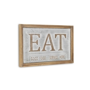 Embrace rustic country style with this captivating Eat sign. Its galvanized front and raised lettering create a striking visual appeal. Framed elegantly, it's prepared to enhance your home or office with its charming presence. Infuse your space with a touch of cozy nostalgia, making it the perfect addition for anyone seeking to merge aesthetics and comfort seamlessly. Product Features: Features an eye-catching whitewashed board Comes with EAT. GOOD FOOD SERVED HERE text printed on board Entirely handmade and hand crafted design Includes a double tier wood frame with a light whitewashed finish Finished with a galvanized steel front and raised lettering Blend of wood and metal materials Recommended for indoor use only Care instructions: wipe clean with a dry cloth Dimensions: 13.5 H x 21.25 W x 1.25 D Material s : metal