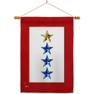 Americana Home & Garden have variety of House Flag Set for all occasions. Uniquely design for hanging indoor or outdoor use. We are committed to offering you exceptional values. Our customers enjoy displaying our House Flag Set for longer periods. For more than a decade, weve been dedicated to manufacturing flags with no comparison in quality and beautiful designs. Our flags are made with our Pro Guard material that is soft to the touch and designs can be read correctly on the flag. A feature that our customers will love. We are committed to using eco-friendly inks that wont leave a foot print in our environment. FeaturesMilitary Beautiful Large House Flag, Wooden Flagpole And Bracket Wall Mount Complete Set with Wood Banner Dowel with String 2" 32" HangerGold & Three Blue Stars House Flag Set Armed Forces Military Service Double-Sided Decorative Vertical Flags Decoration Banner Garden Yard GiftSpecificationsTheme: MilitarySize: 28" x 40"Style: Decorative FlagPole With Adjustable Angle Flag BracketPrint: Double-SidedReadable: Readable Both SidesMaterial: Weather Resistant 3 Layers BlockoutStitching: Double StitchedDisplay: VerticalHang Type: SleeveArtist: Miles O'brienCountry of Origin: United States of AmericaWeight: 2.42 lbs