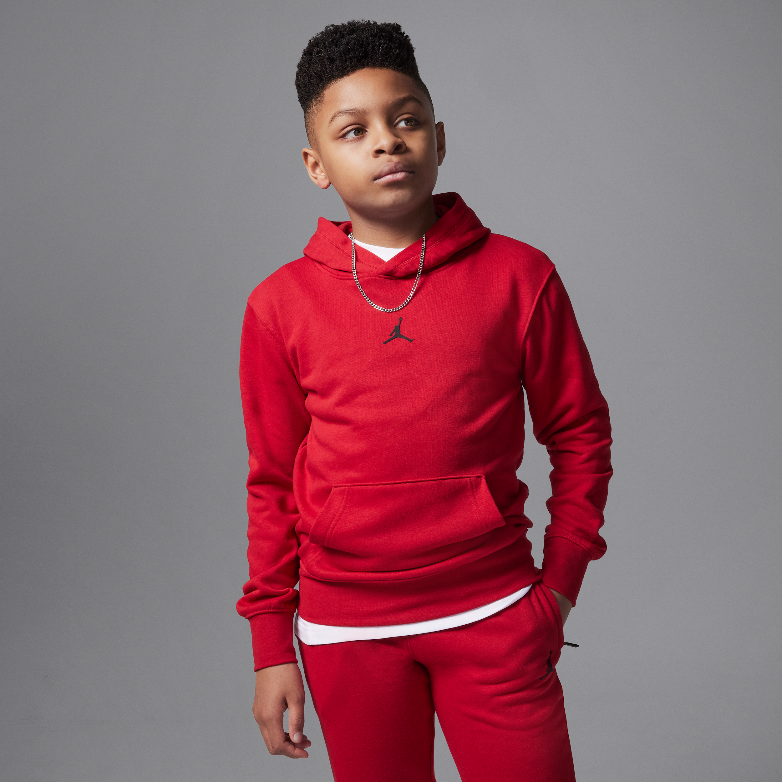 Keep your young athlete comfortable and stylish with this Jordan Dri-FIT hoodie, designed for active kids who need performance wear that works as hard as they do. Made from soft cotton-poly French Terry with recycled fibers, this pullover features advanced Dri-FIT technology that wicks moisture away from the skin to keep them dry during sports practice or casual wear. The relaxed fit with dropped shoulders allows for unrestricted movement, while the kangaroo pocket provides a convenient spot for small essentials or warming hands on cooler days. Perfect for pairing with Jordan basketball shorts or pants for a complete athletic look, this hoodie combines iconic Jordan style with practical performance features. Easy to care for with machine washing, it maintains its quality and vibrant red color through repeated wear. Whether heading to the court, school, or weekend activities, this hoodie delivers the comfort, style, and functionality that active kids and parents appreciate. It's the ideal layer for transitional weather, offering warmth without bulk and keeping kids ready for any activity.