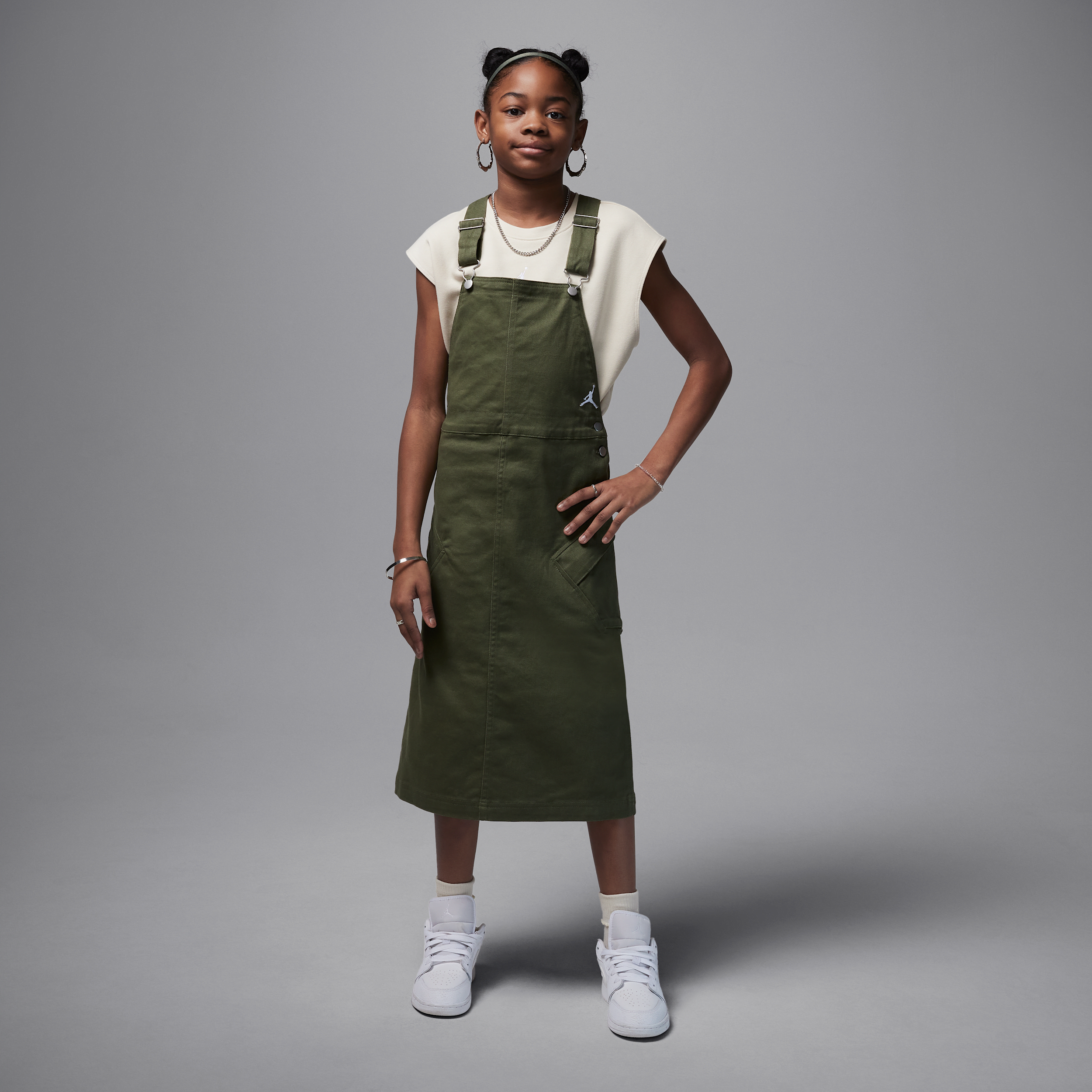 This is the timeless overall dress, Jordan style. It's made of lightweight cotton denim and features cargo pockets on the sides that are roomy enough for items like your phone, wallet, or keys. The straps are adjustable for a comfy fit, and venting on the back hem provides freedom of movement. Style this dress with any Jordan top for a coordinated look. [] Product Details:98% Cotton, 2% Elastane. Machine Wash. Imported. Style: 45D658; Color: Medium Olive; Size: S; Gender: Female; Age Group: Kids | Jordan Big Kids' Essential Overall Dress in Green, Size: Small | 45D658-E6F