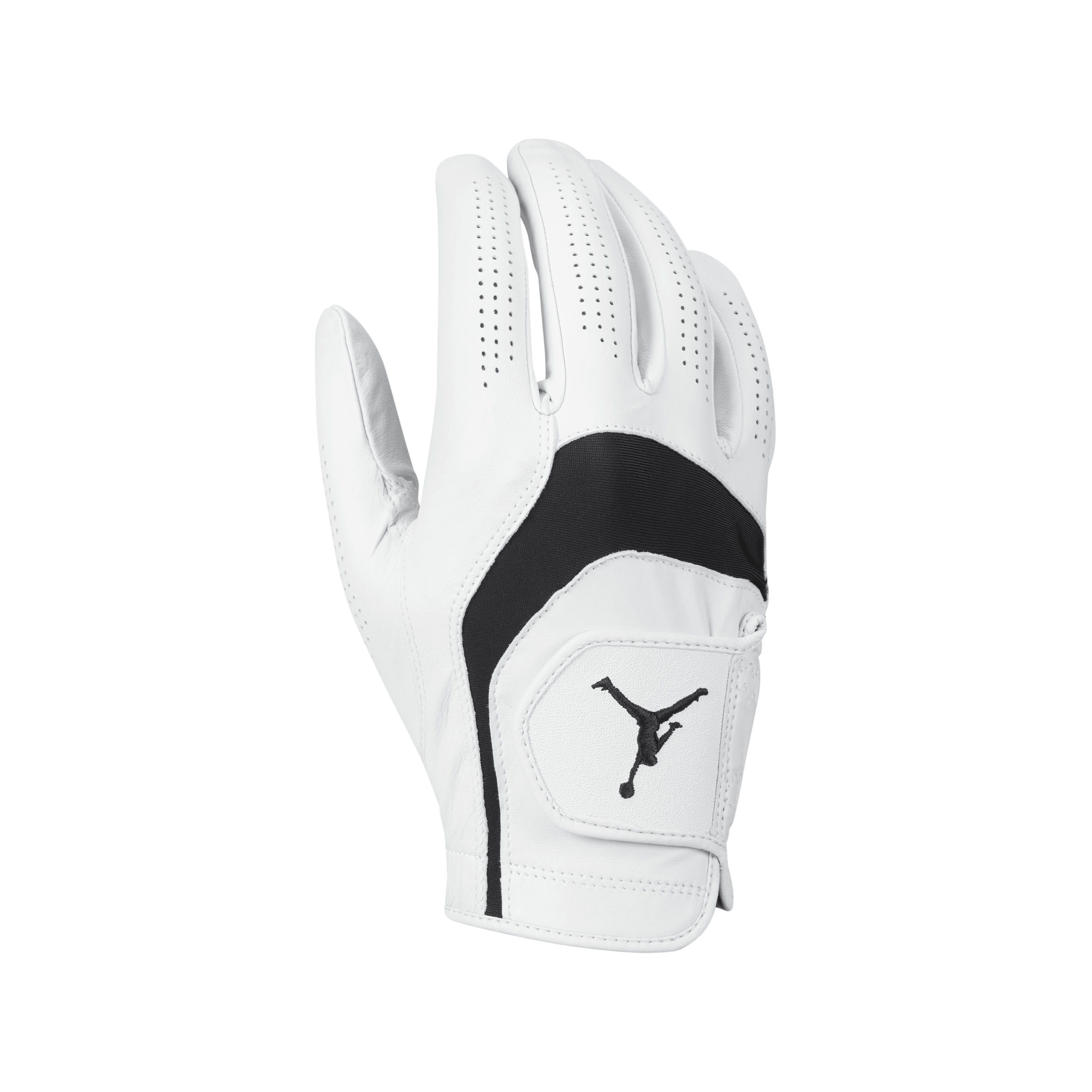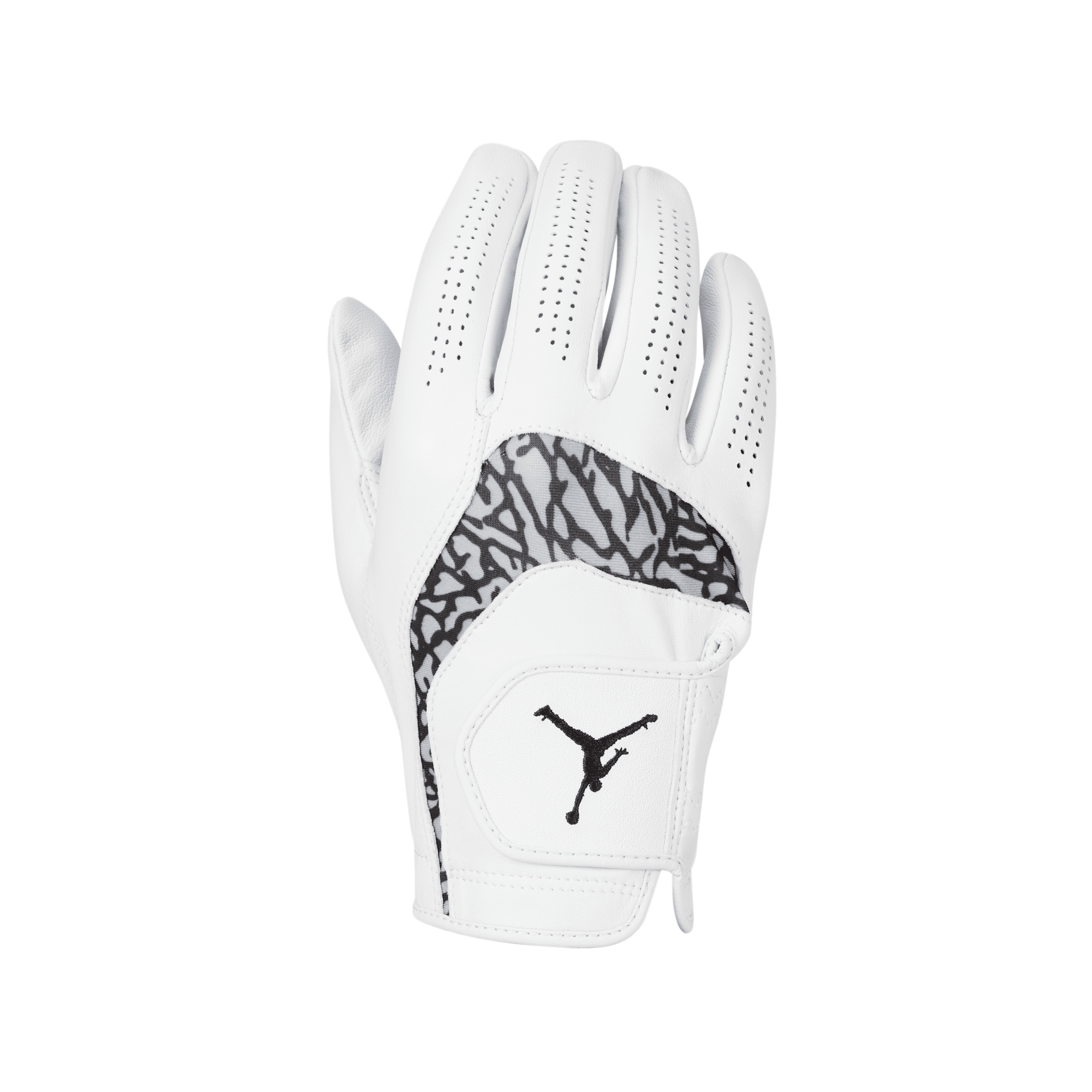 Hit the green in comfort and style. Premium leather is soft while still being durable, and the perforations allow your skin to breathe. The stretch fabric on the back allows your hands to move naturally while you shoot for that hole-in-1. Benefits:Premium leather creates a soft feel and excellent fit, grip and durability. Perforations provide breathability and comfort. Stretch fabric on back of hand allows for natural range of motion. [] Product Details:Palm:100% sheepskin leather. Back:80% sheepskin leather/17% polyester/3% spandex. Other:60% nylon/40% PU coating. Hand wash. Embroidered Jumpman logo. Imported. Style: J1008923; Color: White; Size: M; Gender: Male; Age Group: Adult | Jordan Tour Regular Golf Glove (Right) in White, Size: Medium | J1008923-131